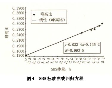 為驗(yàn)證回歸方程的準(zhǔn)確性,對(duì)實(shí)驗(yàn)室制備的SBS摻量為4.3%的SBS改性瀝青進(jìn)行光譜分析,計(jì)算得出4.3%的SBS改性瀝青峰高比(O.2793)帶入回歸的方程中,反推出SBS含量4.31%,與理論值基本一致。表明該回歸程可 作 為SBS 改 性瀝青 SBS含量檢測(cè)的標(biāo)準(zhǔn)計(jì)