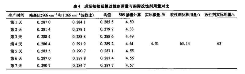 進(jìn)一步驗(yàn)證方法的可行性,同時(shí)對(duì)現(xiàn)場(chǎng)抽檢的樣品進(jìn)行大量的檢測(cè)和SBS用量進(jìn)行統(tǒng)計(jì)反算?,F(xiàn)場(chǎng)通過采集收集一周的生產(chǎn)改性瀝青的用為量和使用的改性用量(生產(chǎn)1400t改性瀝青,程可作消耗改性劑63t(摻量4.5%)),并每天檢測(cè)改算方性劑摻量,通過檢測(cè)連續(xù)十天的摻量的檢測(cè)結(jié)果與所使用掉的改性劑量進(jìn)行對(duì)比(見表4)。