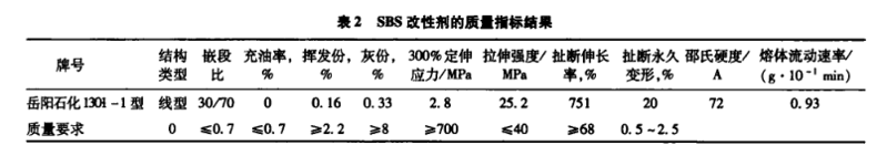 本試驗(yàn)使用的基質(zhì)瀝青為70號(hào)泰普克道路石油瀝青,SBS改性劑為線型岳陽石化1301-1型改性劑,原材料的檢測(cè)結(jié)果見表1和表2。